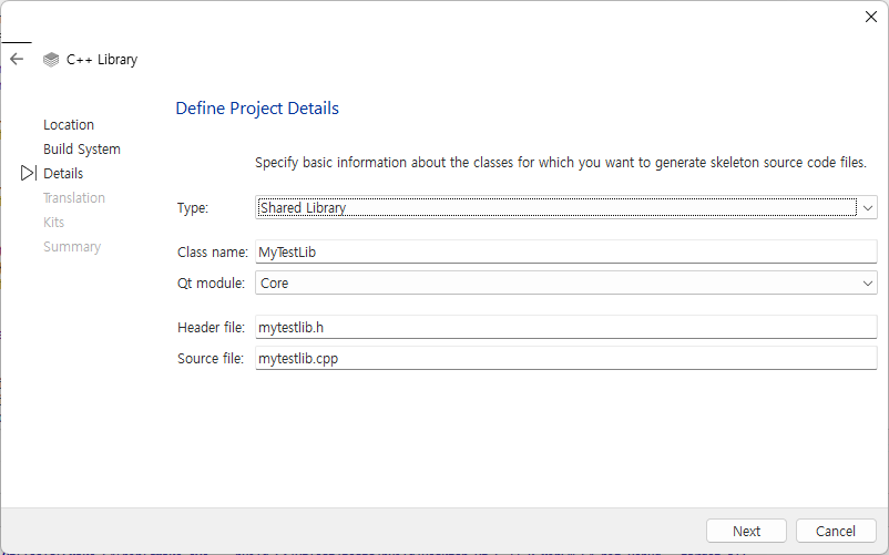 설치 후 Qt Creator에서 C++ Library Project를 생성해 DLL 형태의 라이브러리를 만들었다.