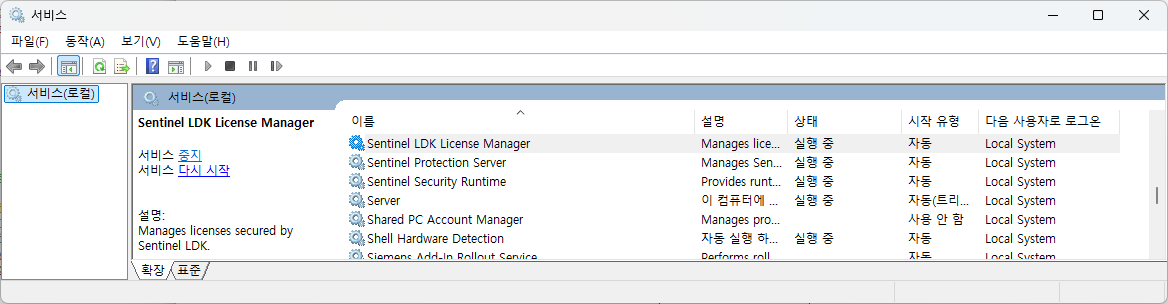 Windows에서는 "Sentinel License Manager" 서비스가 실행 중이어야 하는 것을 알 수 있다.