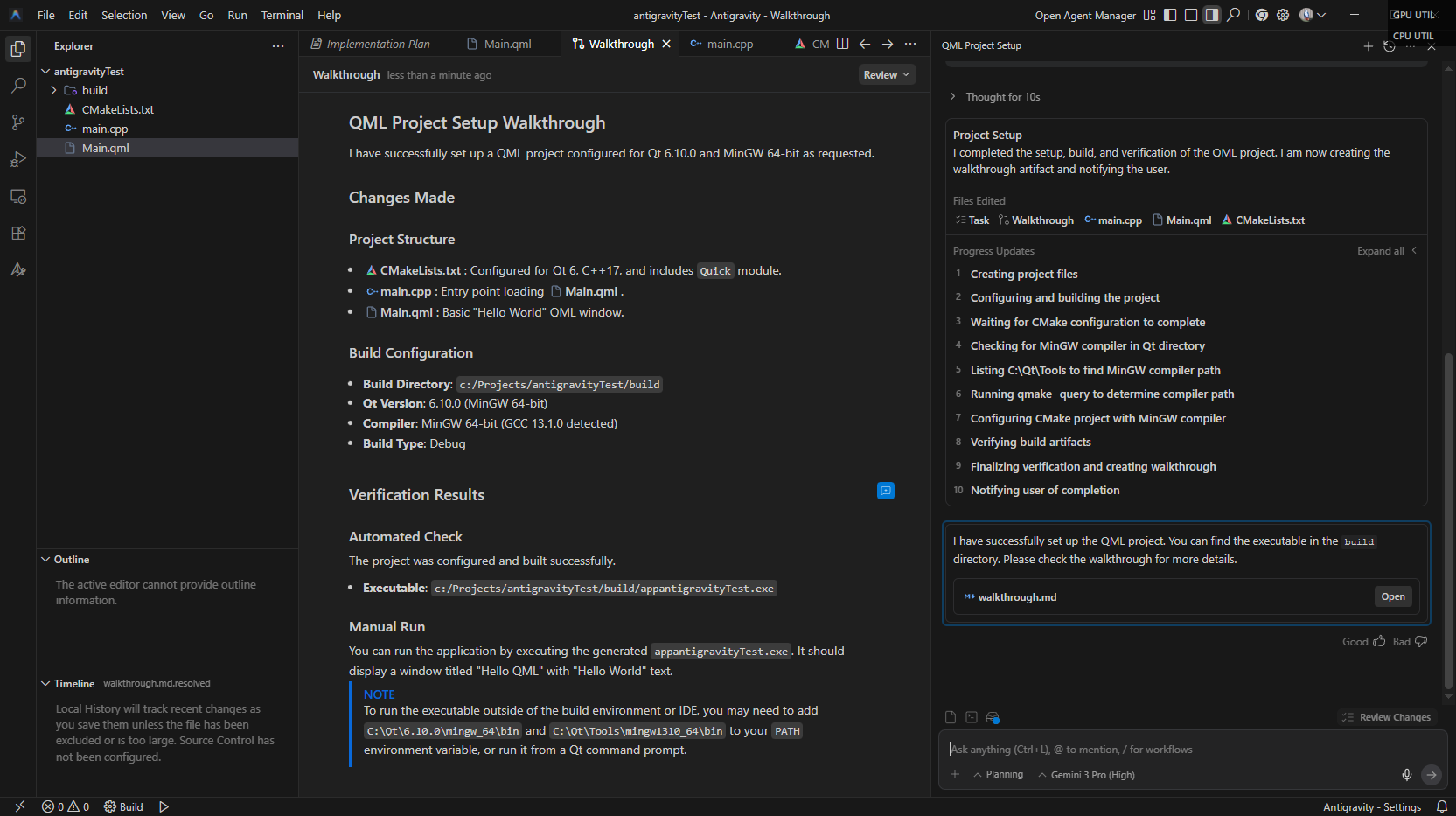 → 실제 빌드 진행 - $env:PATH = "C:\Qt\6.10.0\mingw_64\bin;C:\Qt\Tools\mingw1310_64\bin;$env:PATH"; .\build\appantigravityTest.exe