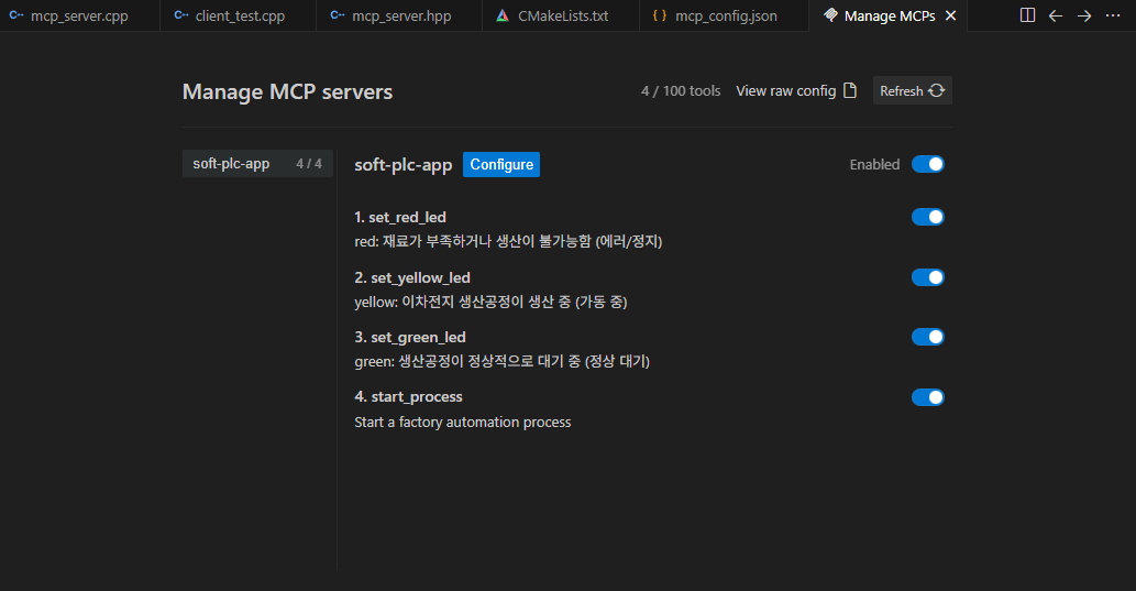 - tools/list : 서버가 가진 도구(Tool)들의 설명서 설명서. ex) LED 켜기/끄기, 공정상태 변경