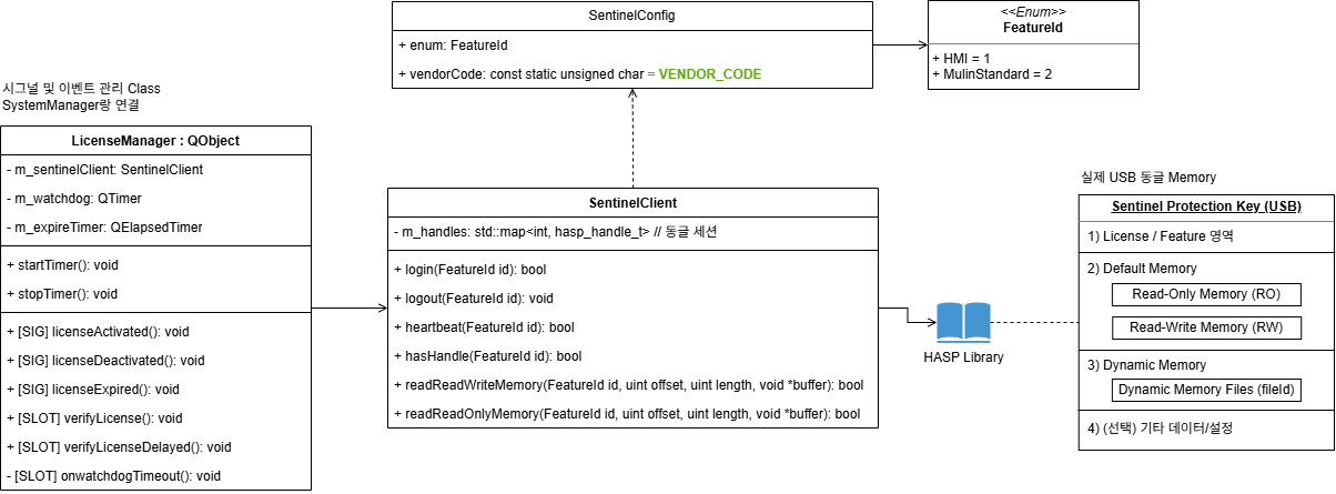 그리고 물리적인 USB 탈착 시 실시간으로 라이선스를 재검증하기 위해 Windows 이벤트 콜백과 LicenseManager::verifyLicense() 함수를 Signal/Slot으로 연결했다.