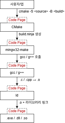 CMake → mingw32-make → g++ → ld → 실행파일(.exe) / 라이브러리(.dll)
