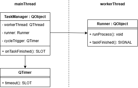 여기서 문제는 실제 인스턴스의 위치(taskManager::runner)와 실행되는 스레드(workerThread)가 달라 헷갈린다는 점이다.