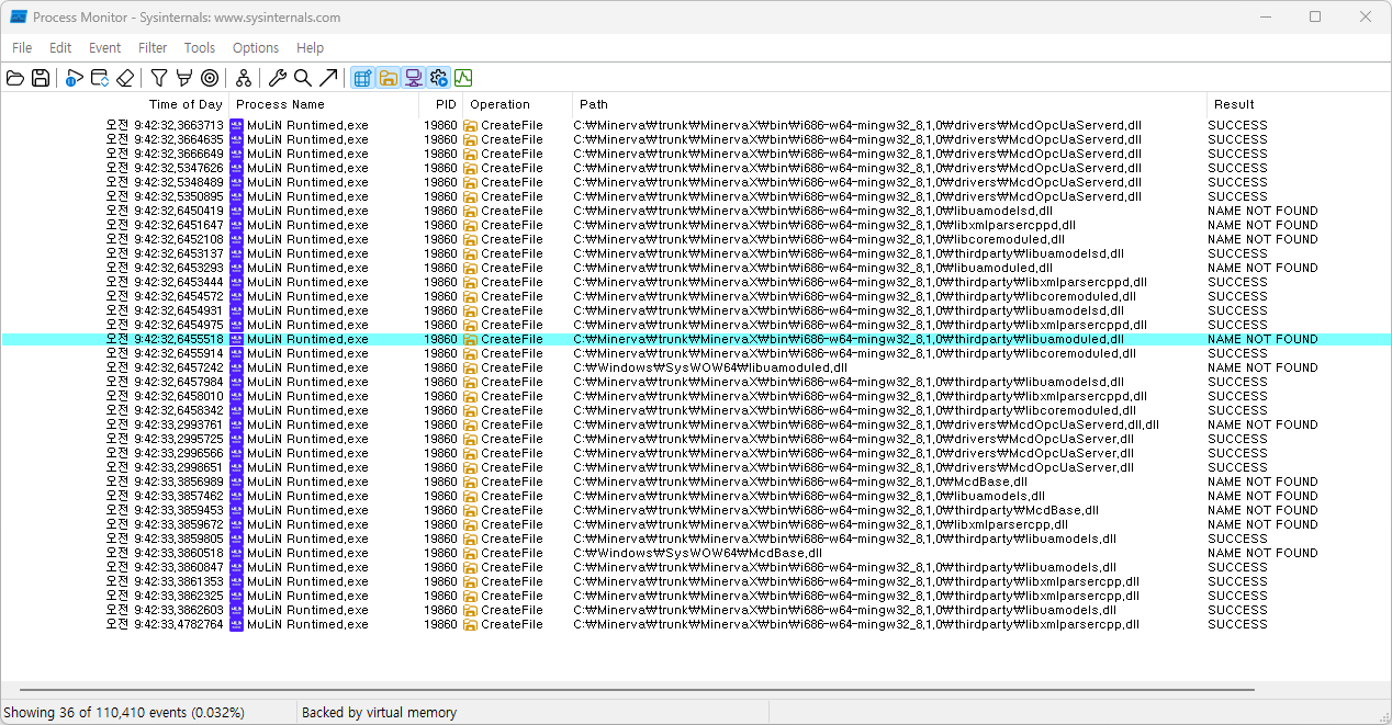 하나씩 살펴보면 다른 dll들은 다른 폴더에서라도 한번씩 SUCCESS가 되는데, libuamodule.dll 은 NAME NOT FOUND 만 있는걸 알 수 있다.